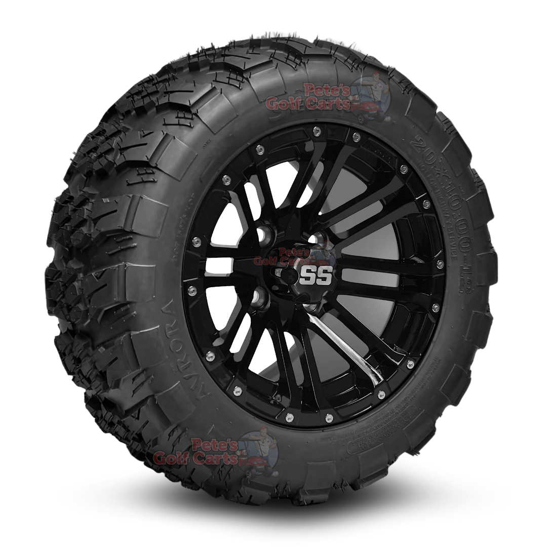 Unleash raw power and style with our 12โณ HD3 Gloss Black Golf Cart Wheels & Aurora AllTerrain Tires Combo. This ultimate upgrade for many non-lifted golf carts boastsย performance and attitude. This beastly setup mounts the unique 12โณ HD3 Gloss Black aluminum wheel to the aggressive 20ร10-12 Aurora All-Terrain tires delivering jaw-dropping grip, rock-solid durability, and buttery-smooth handling. Perfect for campgrounds, farms, and mild trails, the Aurora’sย non-directional tread is engineered for maximum traction.