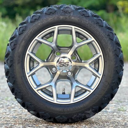 12″ Rally Gunmetal Aluminum Golf Cart Wheels and 20×10-12 DOT All Terrain Tires Combo – Set of 4