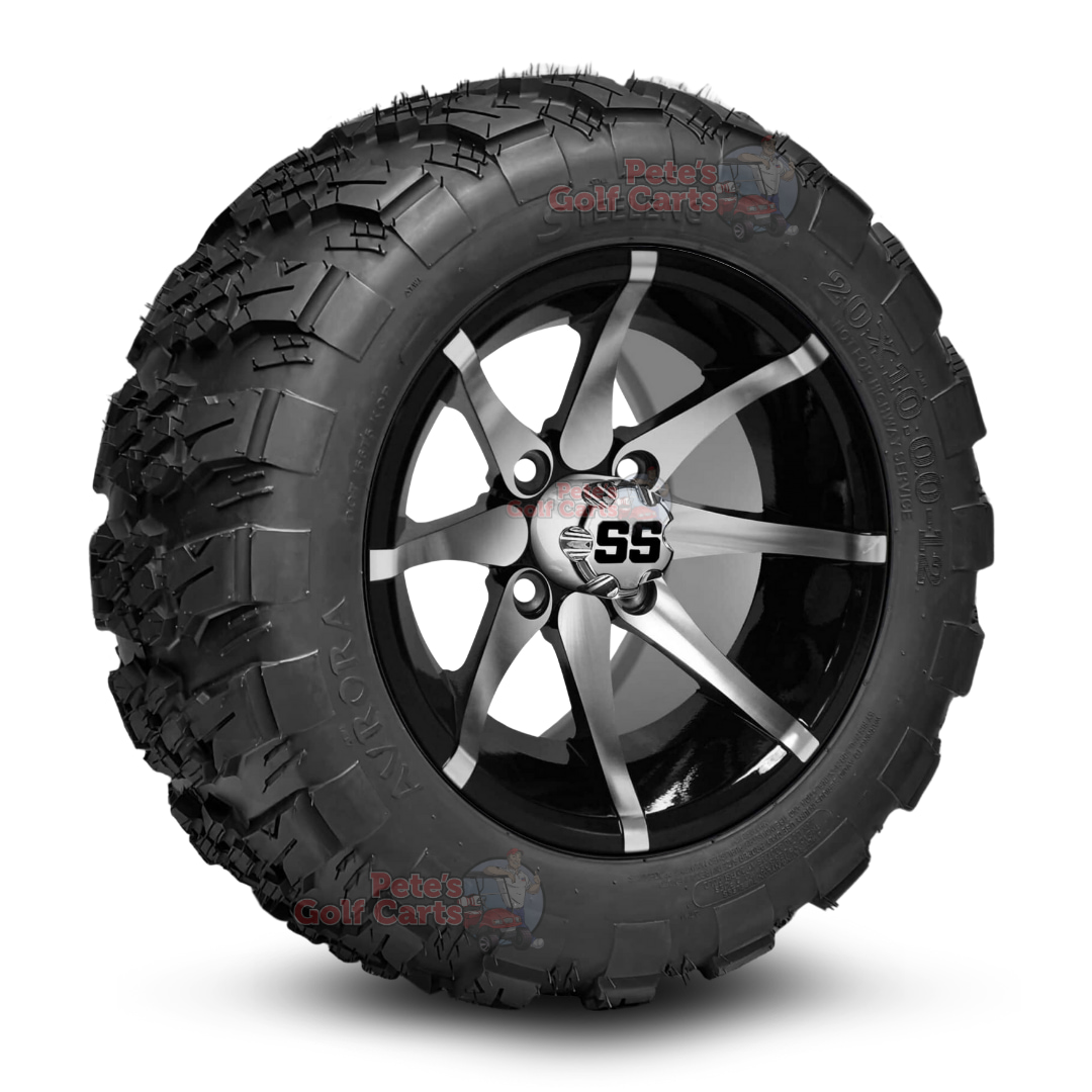 12″ Kraken Black/Machined Golf Cart Wheels and 20″ย All Terrain Tires Combo – Set of 4 (20″ tall)