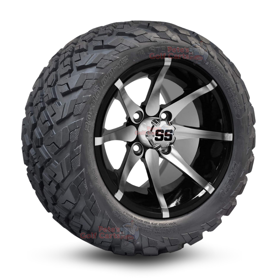 12″ Kraken Black/Machined Golf Cart Wheels and 20″ย All Terrain Tires Combo – Set of 4 (20″ tall)