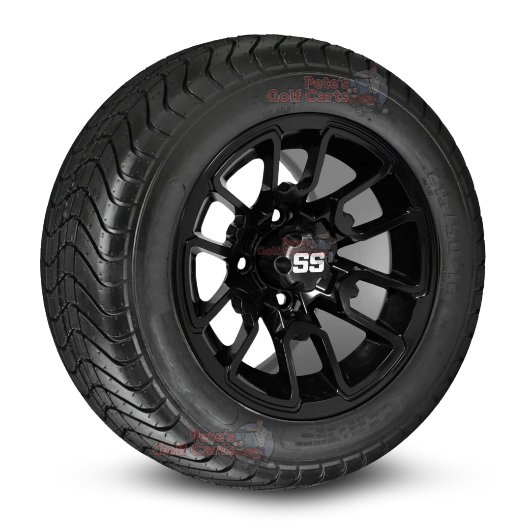Grab this 12″ gloss black Lizard wheels and 215/50-12 golf cart tires combo today and get ready to feel the difference!