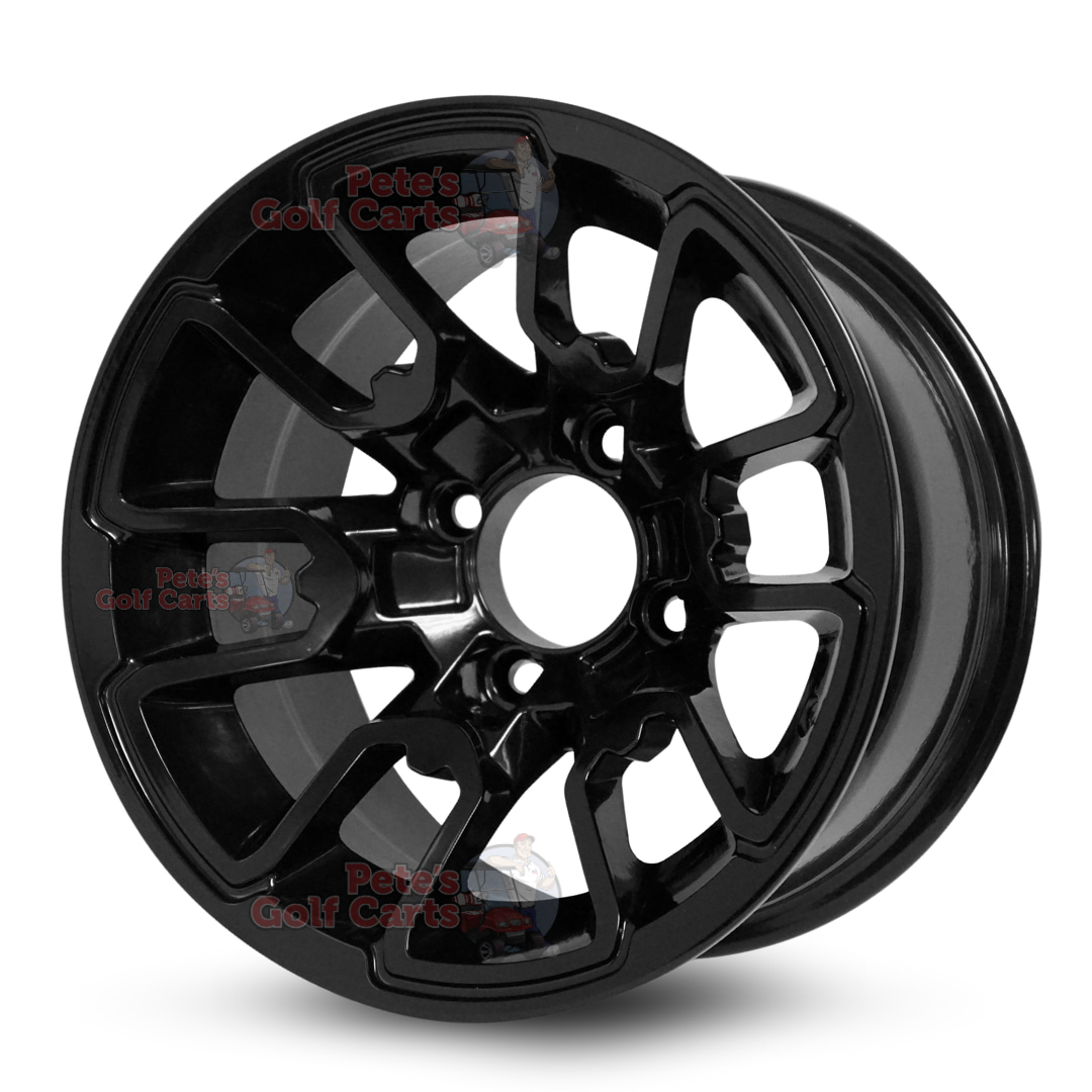 - 4ย x 12″ Lizard gloss black aluminum golf cart wheels mounted on