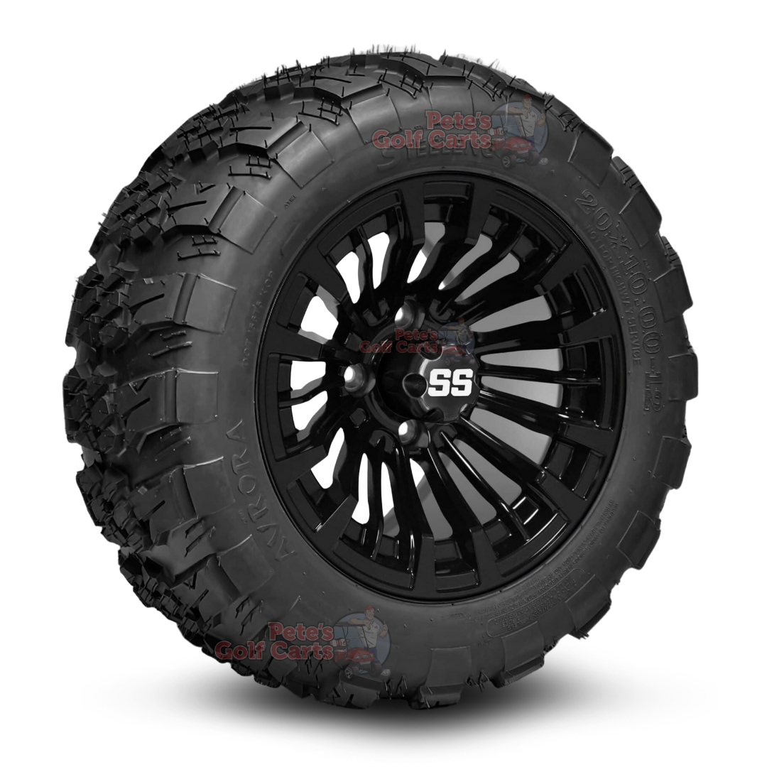 12″ Matador Gloss Black Golf Cart Wheels and 20″ย All Terrain Tires Combo – Set of 4 (20″ tall)