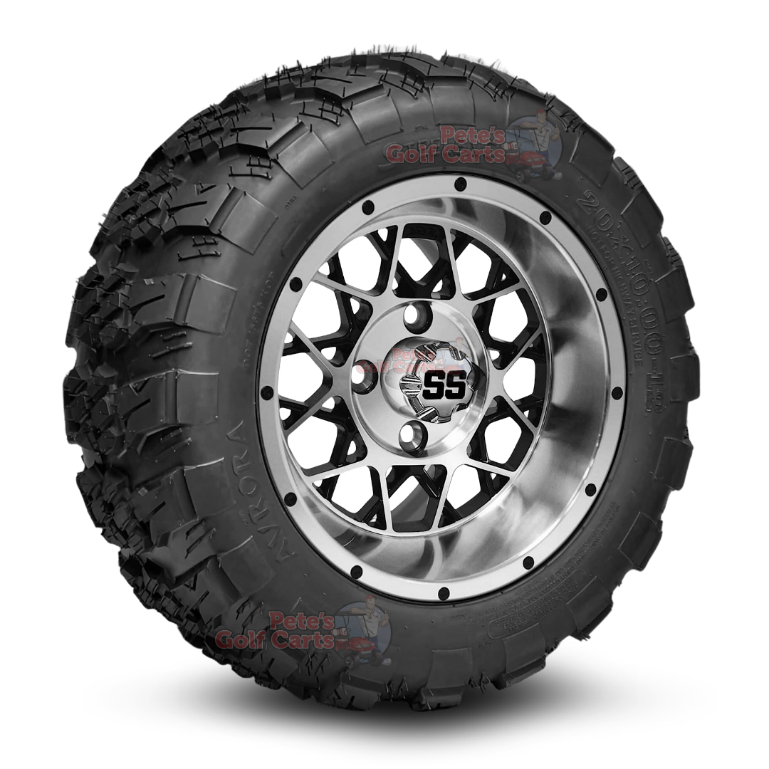 Tap into a new level of power with our 12โณ Matrix Black/Machined Golf Cart Wheels & 20×10-12 Aurora All Terrain Golf Cart Tires combo! This electrifying upgrade gives non-lifted golf carts unmatched style and attitude. The detailed 12โณ Matrix aluminum wheels great great with the 20×10-12 Aurora tires, featuring non-directional tread that is DOT approved and engineered for maximum traction across campgrounds, farms, and mild trails. Bolt-on installation means zero fuss, just instant performance and a sleek, high-impact look.