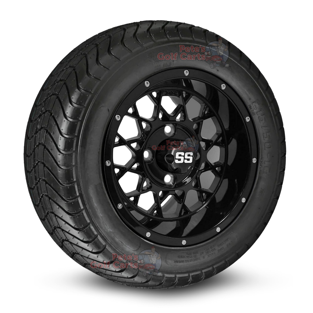 Grab this 12″ gloss black Matrix wheels and 215/50-12 golf cart tires combo today and get ready to feel the difference!