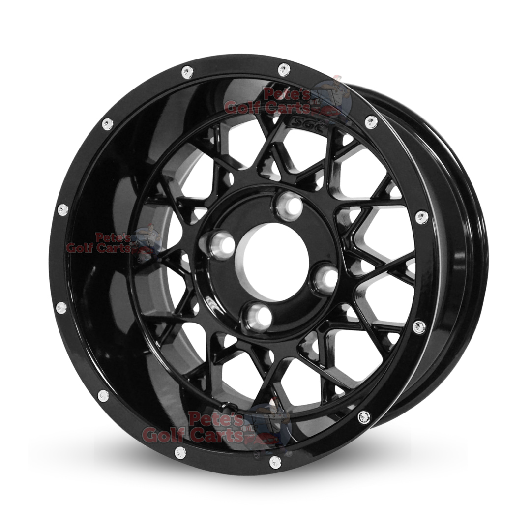 - 4ย x 12″ Matrix gloss black aluminum golf cart wheels mounted on