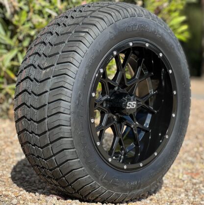 The 12″ Matrix Gloss Black golf cart wheels are a beautifully black painted, detailed 12″ rim. We been combined with a selection of 215/50-12 DOT approved street and turf tires that provide a comfortable ride! The sleek 12″ golf cart wheels will prompt compliments from the folks in your golf cart community! This setup is great because it fits under many carts without a lift kit! EZGO TXT & RXV as well as Yamaha G29 (Drive) & Drive2 model carts can fit these tires without a lift kit as long as the rear suspension is in good shape or upgraded to Heavy Duty Rear Leaf Springs/ Yamaha Coil Springs!