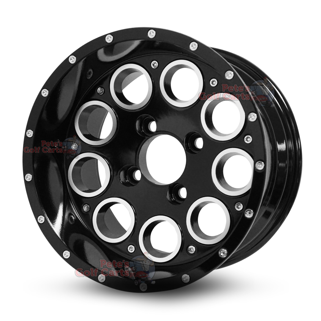 • 4ย  x 12″ Pioneer gloss black aluminum golf cart wheels mounted on
