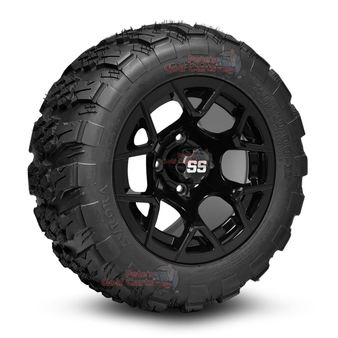 12″ Rally Gloss Black Golf Cart Wheels and 20×10-12 Aurora All Terrain Golf Cart Tires Combo – Set of 4 (20″ tall)