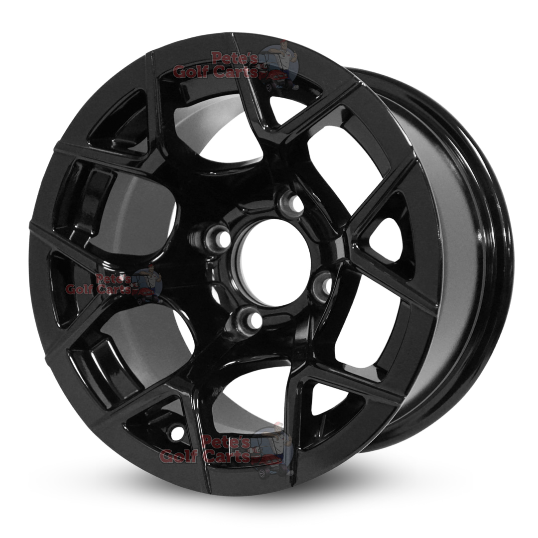 - 4ย x 12″ Rally gloss black aluminum golf cart wheels mounted on
