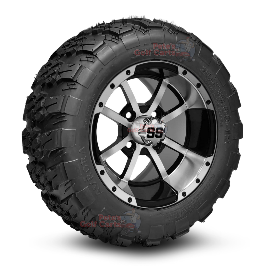 Command every ride with these 12โณ Storm Trooper Black/Machined Golf Cart Wheels & 20″ tall Aurora All-Terrain Tires combo. Designed for many non-lifted golf carts (see Tire Fitment section below), this battle-ready package combines the striking 12″ Storm Trooper aluminum wheels with 20×10-12 Aurora DOT all terrain golf cart tires built for pavement, campgrounds, farms, and light trails. The non-directional tread provides confident traction while the black/machined finish delivers unmistakable presence.