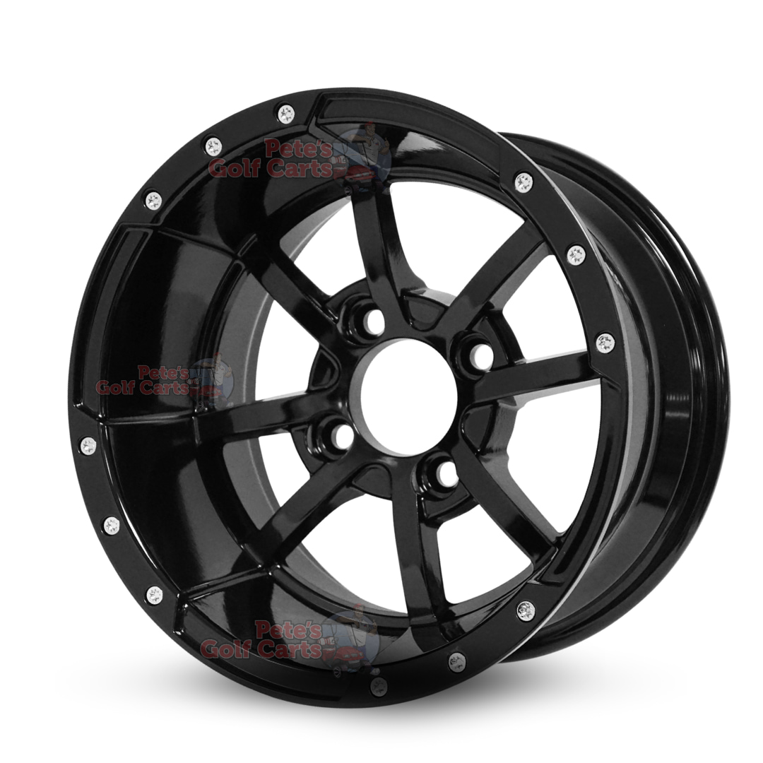 - 4ย x 12″ Storm Trooper gloss black aluminum golf cart wheels mounted on