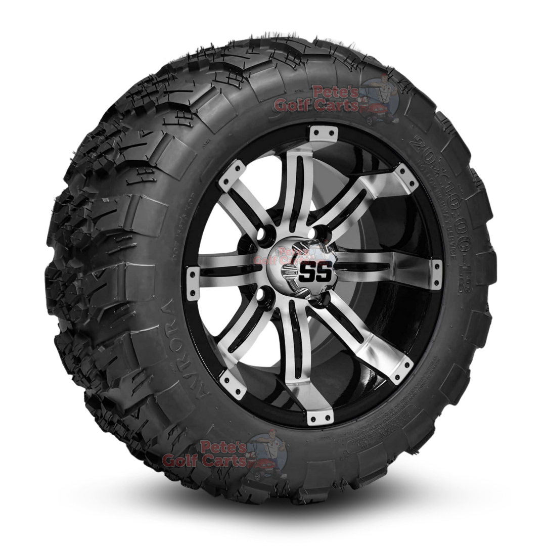 12″ Tempest Black/Machined Golf Cart Wheels and 20″ย All Terrain Tires Combo – Set of 4 (20″ tall)