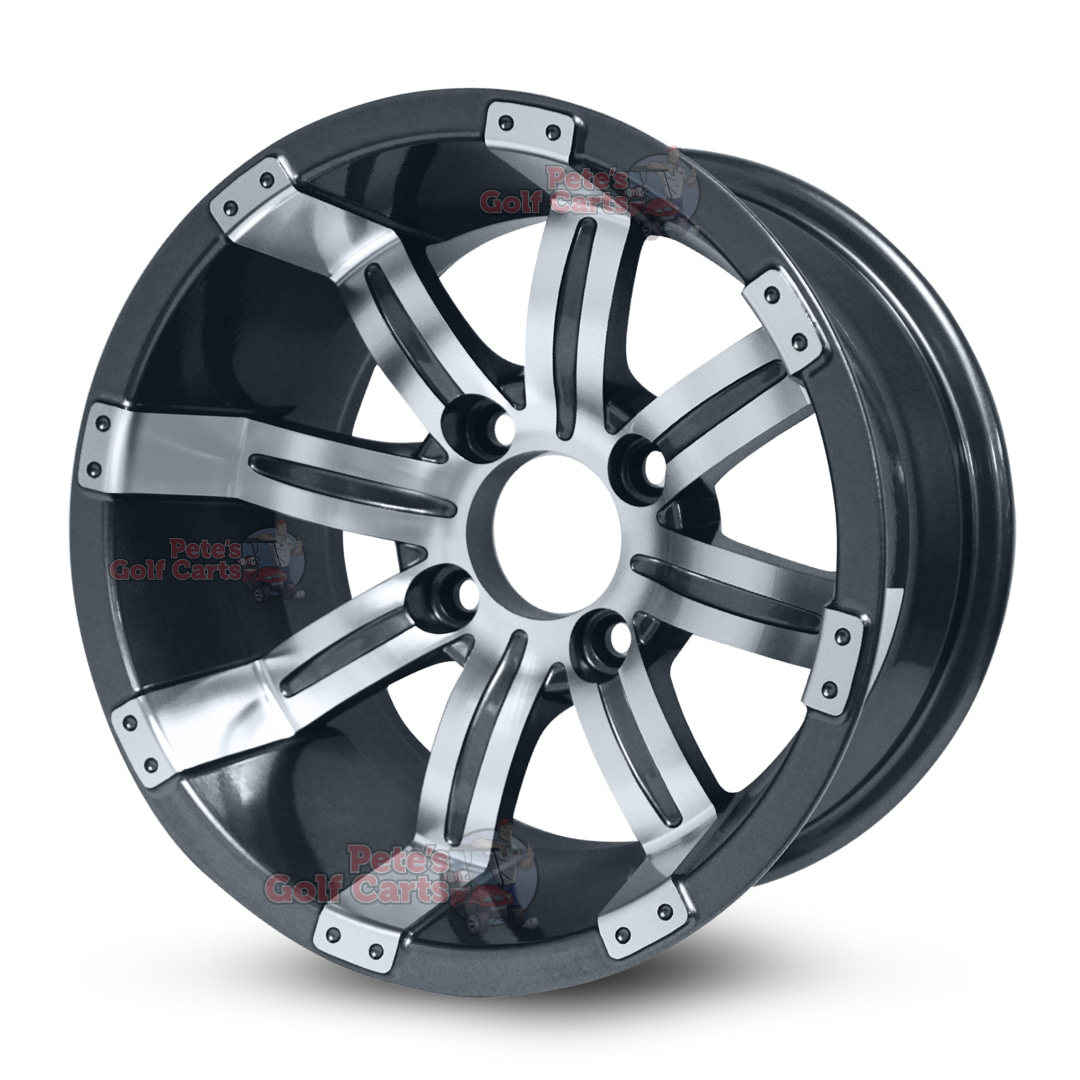 - 4 x 12″ Tempest gunmetal aluminum golf cart wheels mounted on
