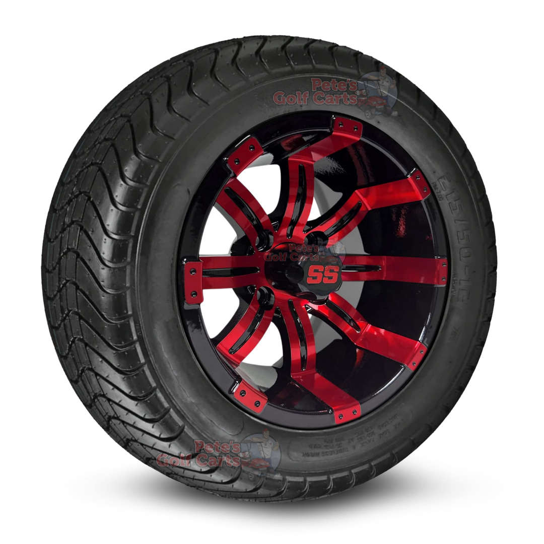 Grab this 12″ red/black Tempest wheels and 215/50-12 golf cart tires combo today and get ready to feel the difference!