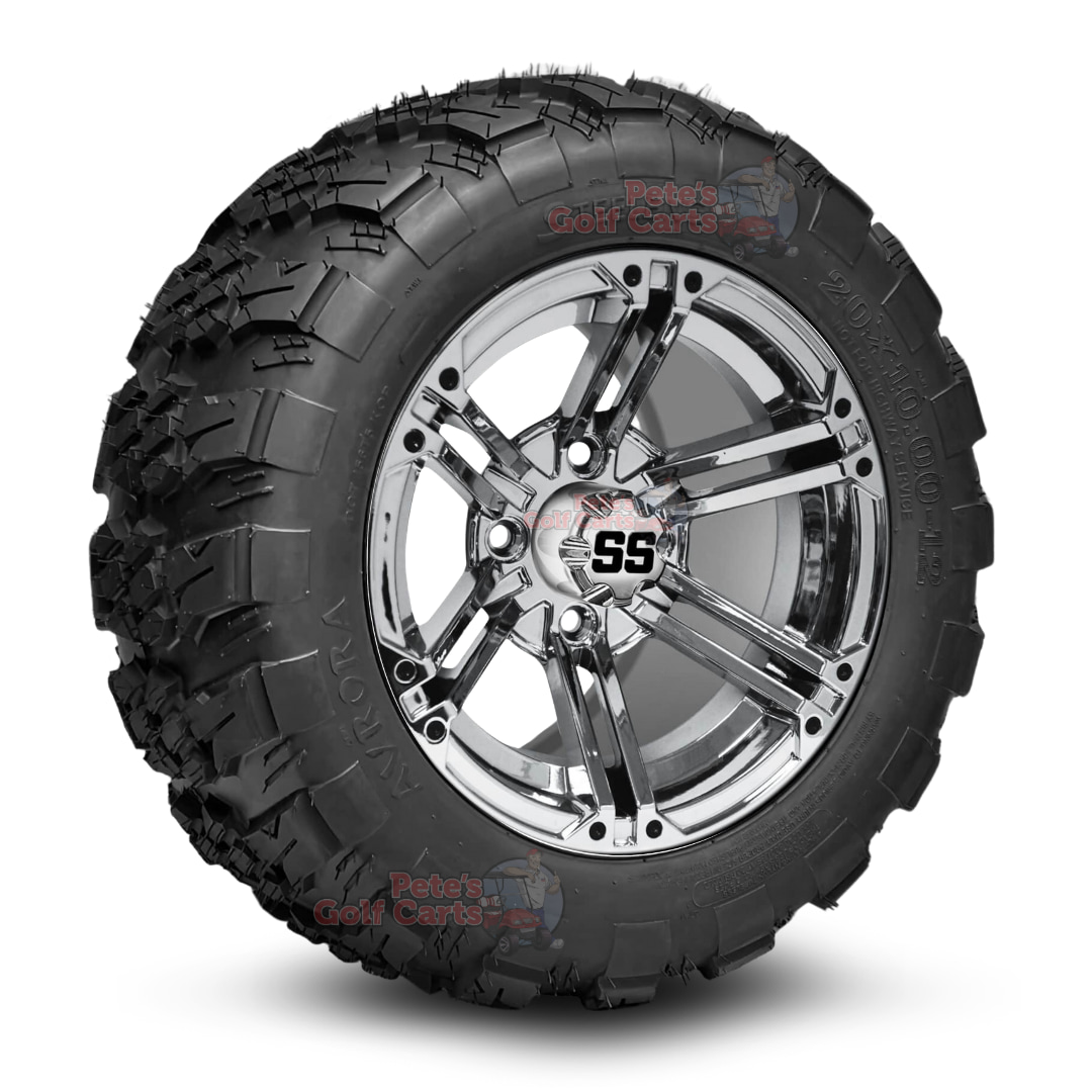 Unleash raw power and style with our 12โณ Terminator Chrome Golf Cart Wheels & Aurora AllTerrain Tires Combo. This ultimate upgrade for many non-lifted golf carts boastsย performance and attitude. This beastly setup mounts the unique 12โณ Terminator Chrome aluminum wheel to the aggressive 20ร10-12 Aurora All-Terrain tires delivering jaw-dropping grip, rock-solid durability, and buttery-smooth handling. Perfect for campgrounds, farms, and mild trails, the Aurora’sย non-directional tread is engineered for maximum traction.