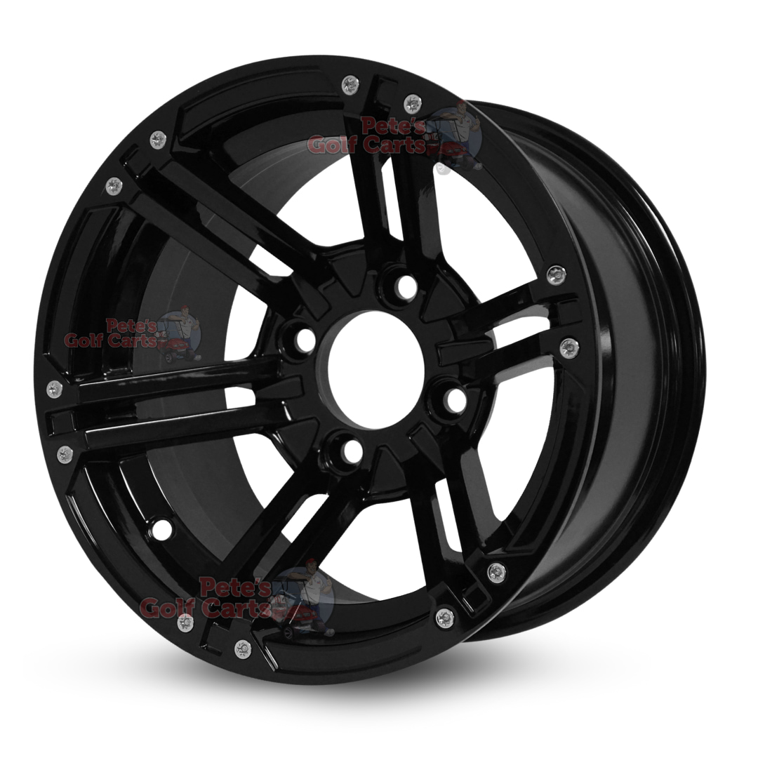 - 4ย x 12″ Terminator gloss black aluminum golf cart wheels mounted on