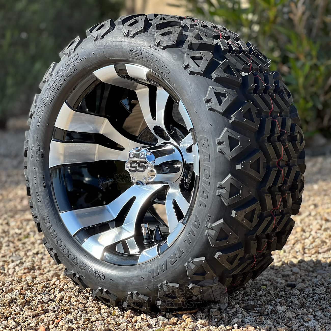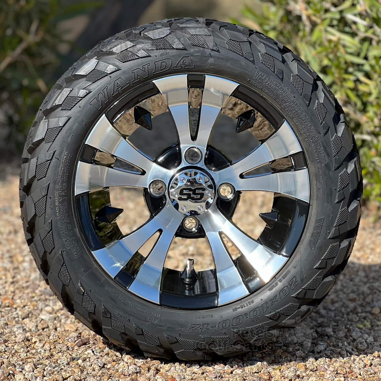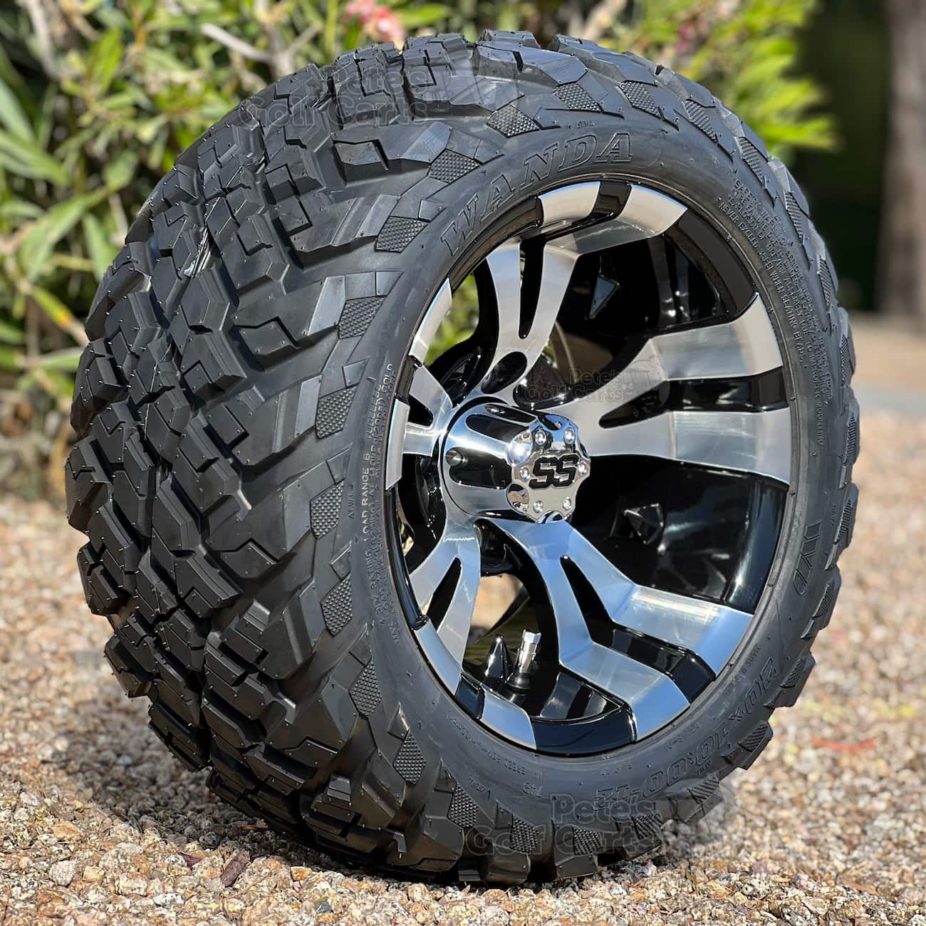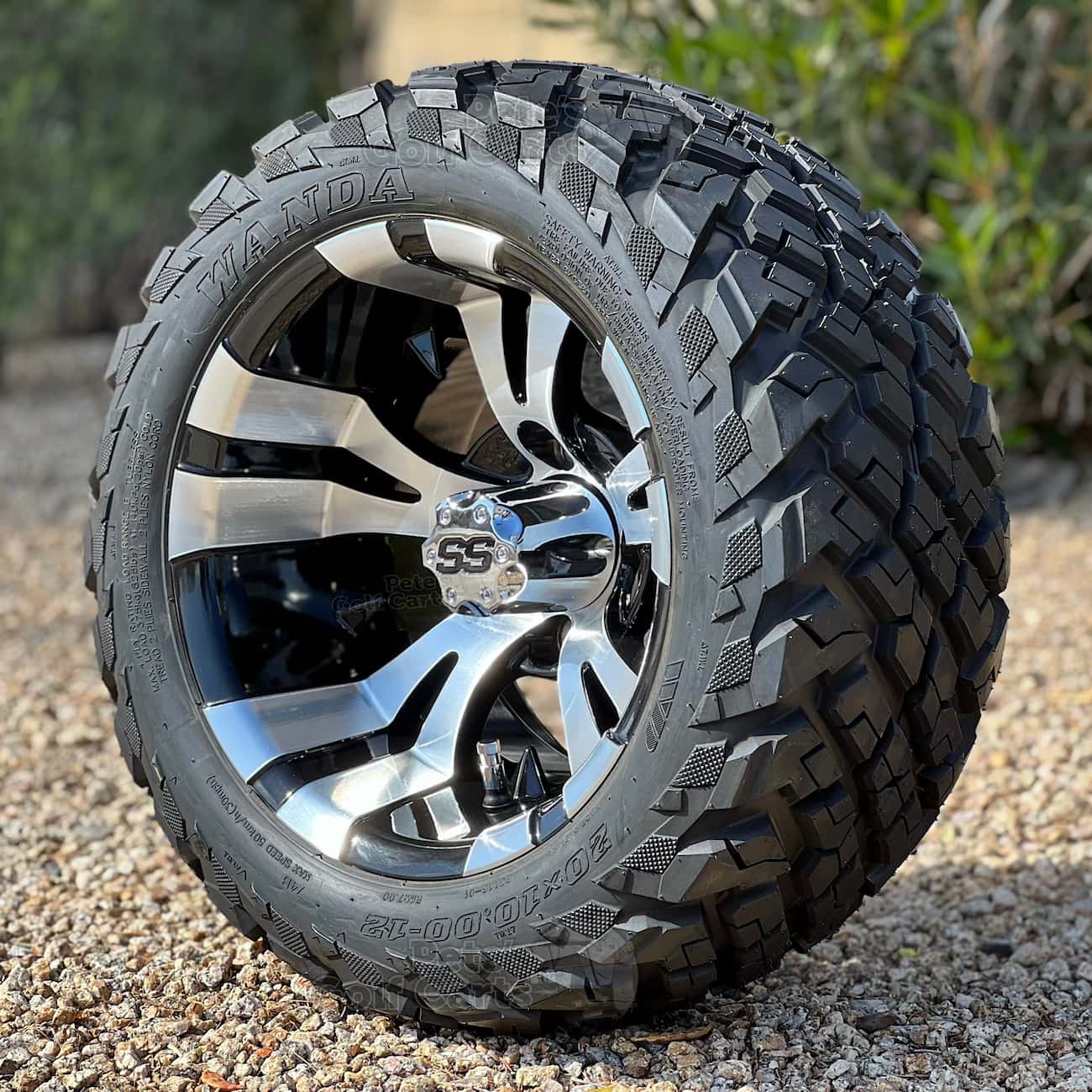 12″ Vampire Black/Machined Aluminum Golf Cart Wheels and 20×10-12 DOT All Terrain Tires Combo – Set of 4 (20″ tall)
