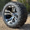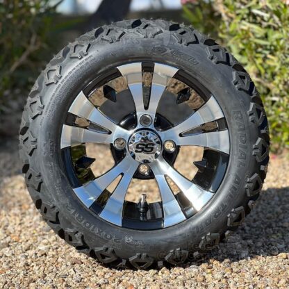 Our 12″ Vampire Black/Machined golf cart wheels and the 20×10-12 DOT all terrain golf cart tires combo is hard to beat! Taking one of the most popular golf cart wheel designs and combining it with a 20″ tall DOT all terrain tire that goes under many non-lifted or modified golf carts is one of Pete’s greatest ideas yet! The fabulous spoke design on the 12″ Vampire wheels reflects the sun and captures the attention of onlookers as you roll by! There is a reason this has been arguably (but with reasonable speculation!) the highest selling golf cart wheel over the past 10 years running.