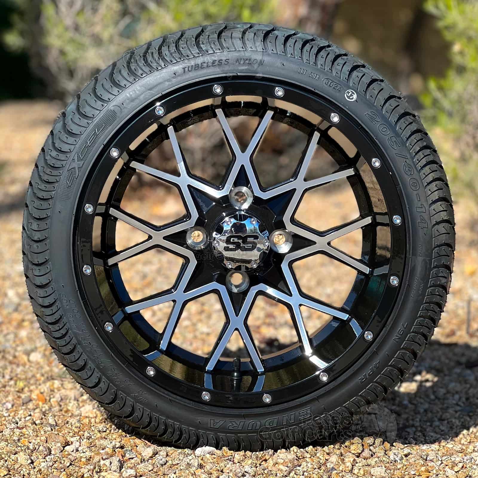 The 14″ Matrix Machined/Black golf cart wheels come wrapped with our Excel Endura 205/30-14 DOT Approved Street & Turf Tires for a killer combo! The brilliant machined spokes and intricate design is reflects the sun and will catch the eye of onlookers. Standing 20″ tall, these 205/30-14 tires are the perfect setup for many non-lifted golf carts included EZGO TXT, EZGO RXV, Yamaha G29, Yamaha Drive, and Yamaha Drive2! The low profile 205/30-14 street tires provide a stellar ride on the the streets and cart paths while remaining gentle on the golf course turf or neighborhood lawn!