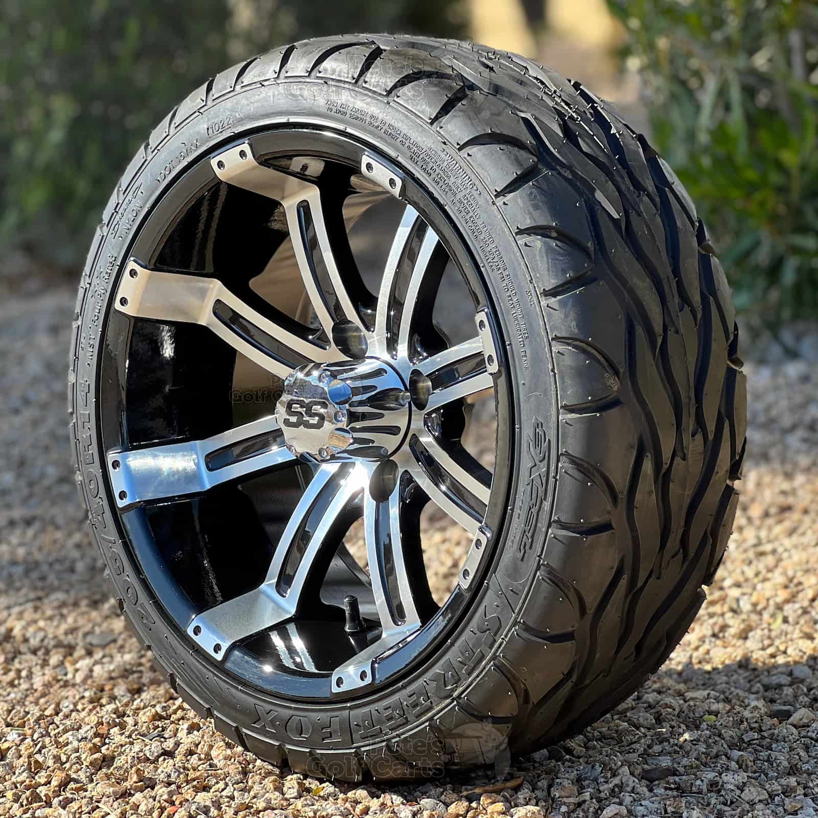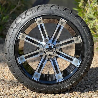 14″ Tempest Black/Machined Golf Cart Wheels and 205/40-14 DOT Approved Street & Turf Tires Combo – Set of 4 (20″ tall)