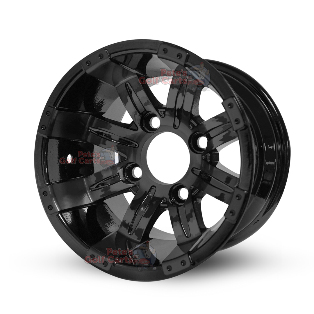 - Qty 4: 10″x7″ Tempest Gloss Black Golf Cart Wheels with ET-15 Offset