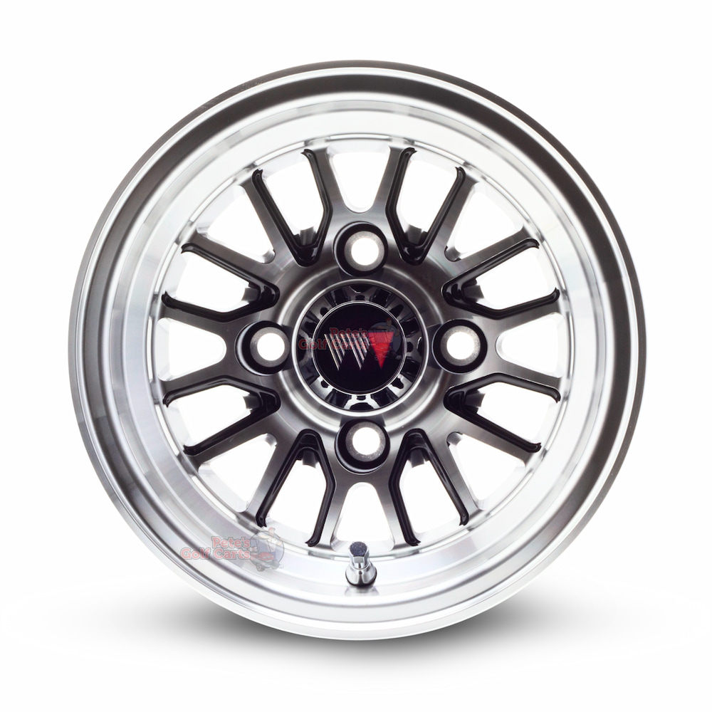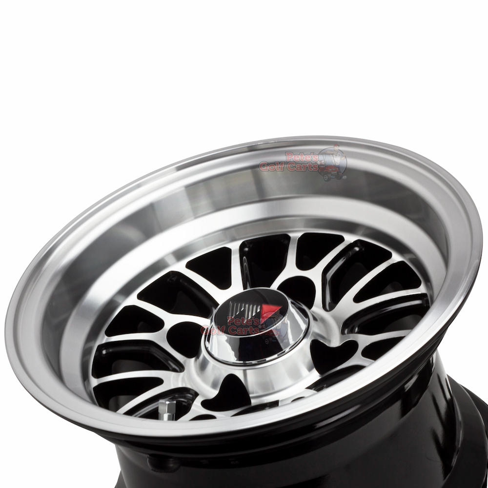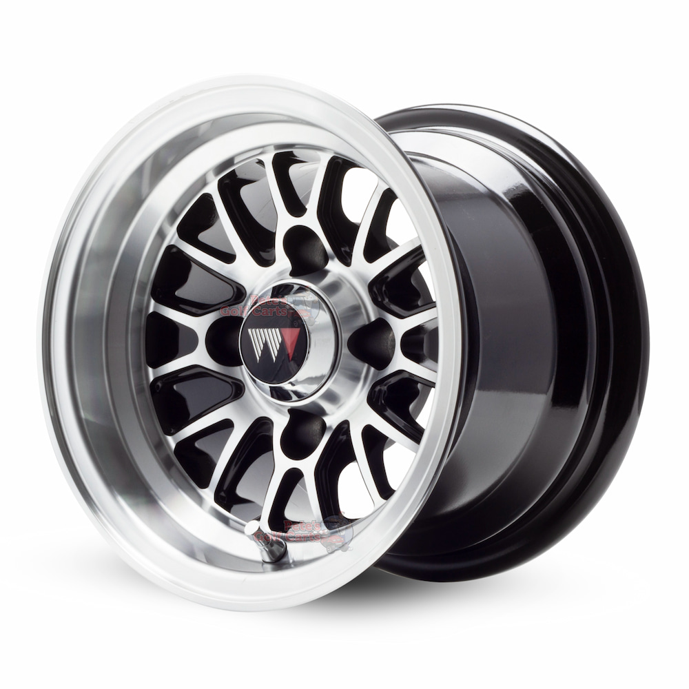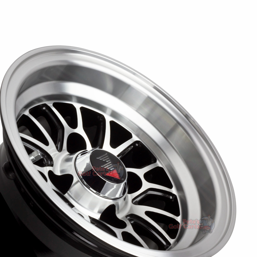The Black/Machined 10″ TYPE V aluminum golf cart wheels are premium 10″ golf cart wheels that are truly next-level and allow your cart to stand out from the rest. This custom golf cart wheel design by Wheel Mate, the Type V, are a staple in their lineup. The wheel starts with a deep and uniform gloss black paint job that then goes through a machining process. It is then finished with a deep clear coat that both protects the wheel and provides that smooth feel.!