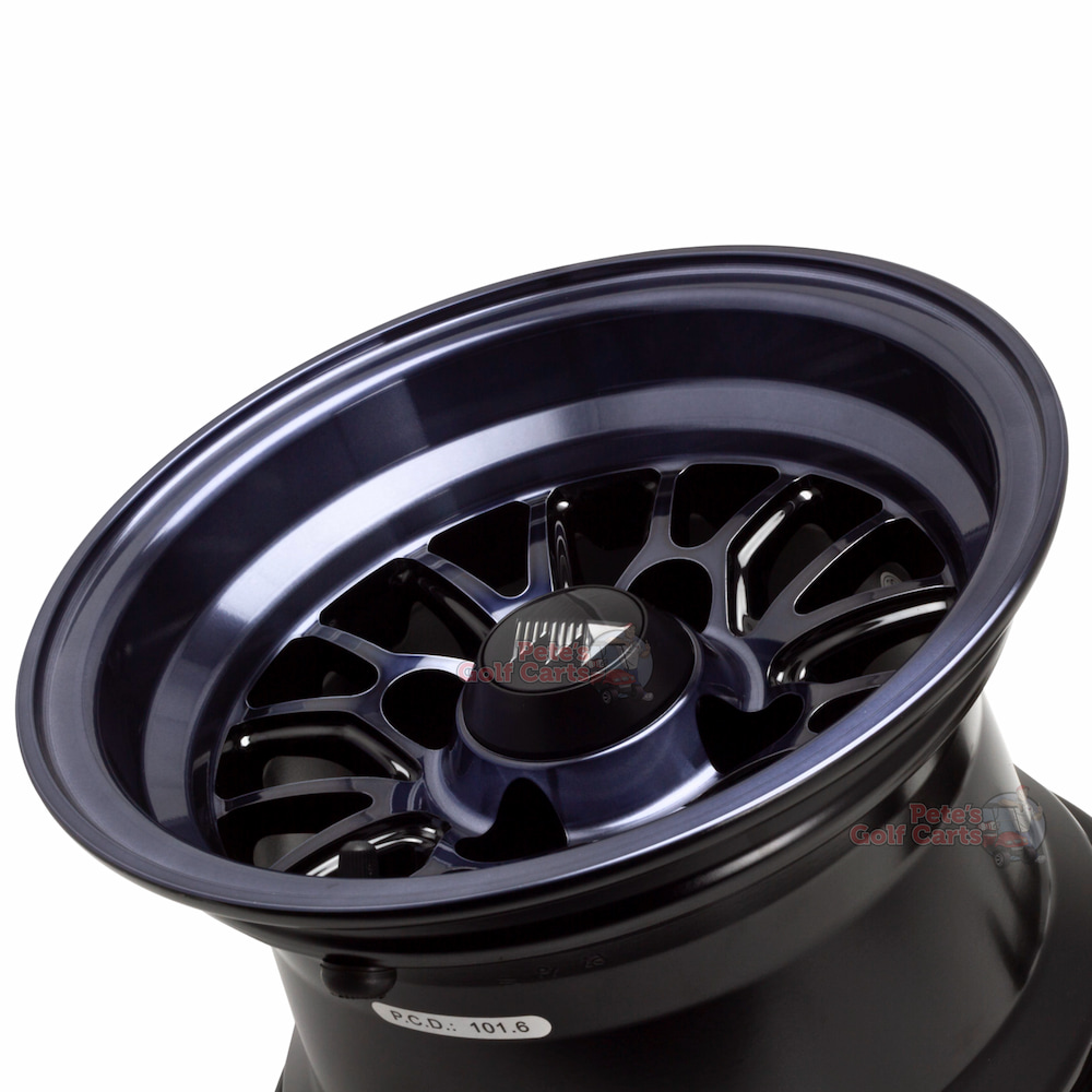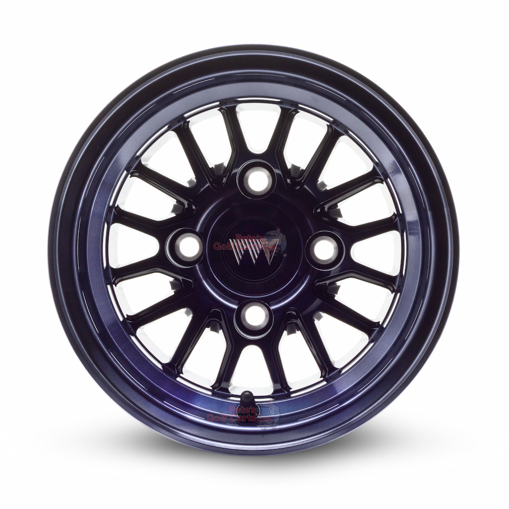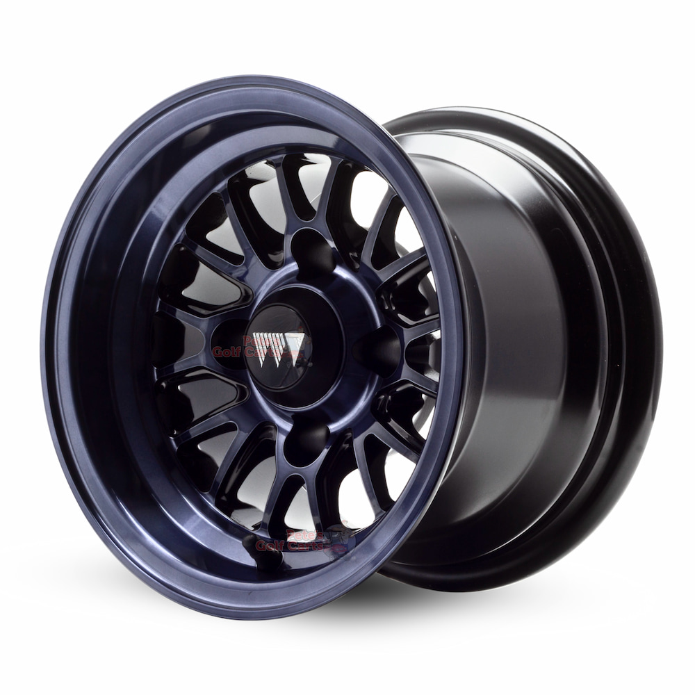 Our 10″ TYPE V Midnight Gunmetal aluminum golf cart wheels are premium 10 inch golf cart wheels that are truly unique. This custom golf cart wheel design, the Type V, are a staple in the Wheel Mate lineup. The one of a kind dark gunmetal finish starts with a smooth machined aluminum process and is finished with a deep gunmetal clear coat that both protects the wheel but makes it stand out beautifully!