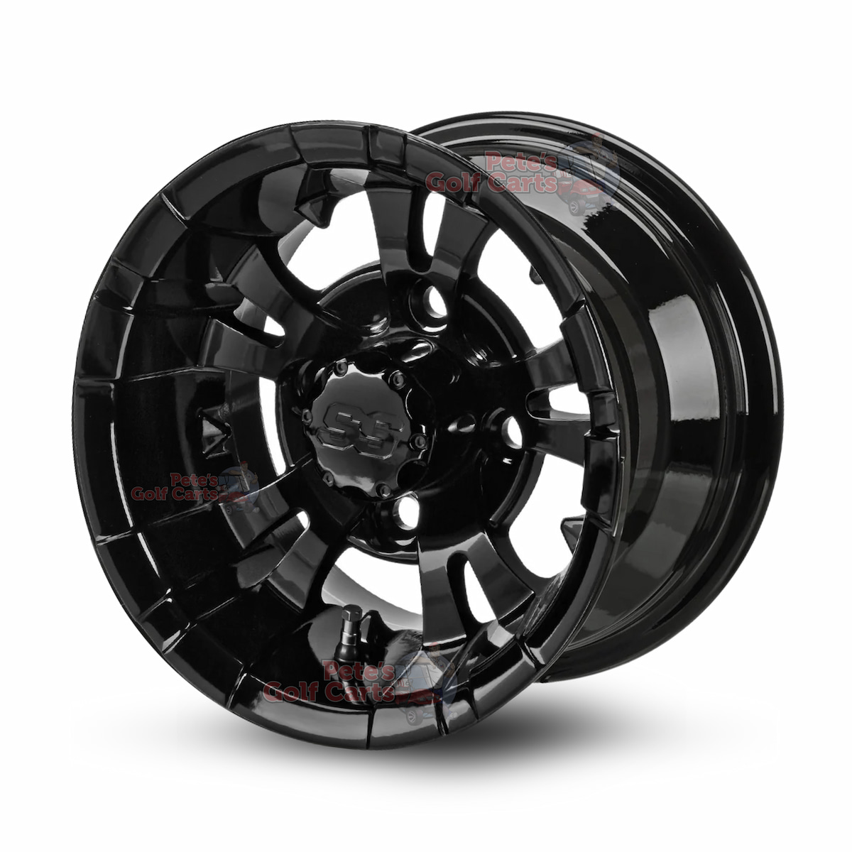 - Qty 4: 10″x7″ Vampire Gloss Black Golf Cart Wheels with ET-15 Offset