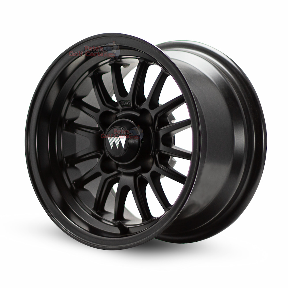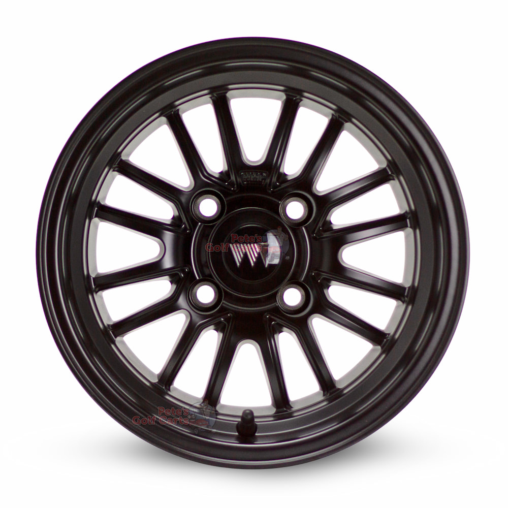 - 4 x 12″ Type V Matte Black Wheel Mate Aluminum Golf Cart Wheels (ET-5mm offset)