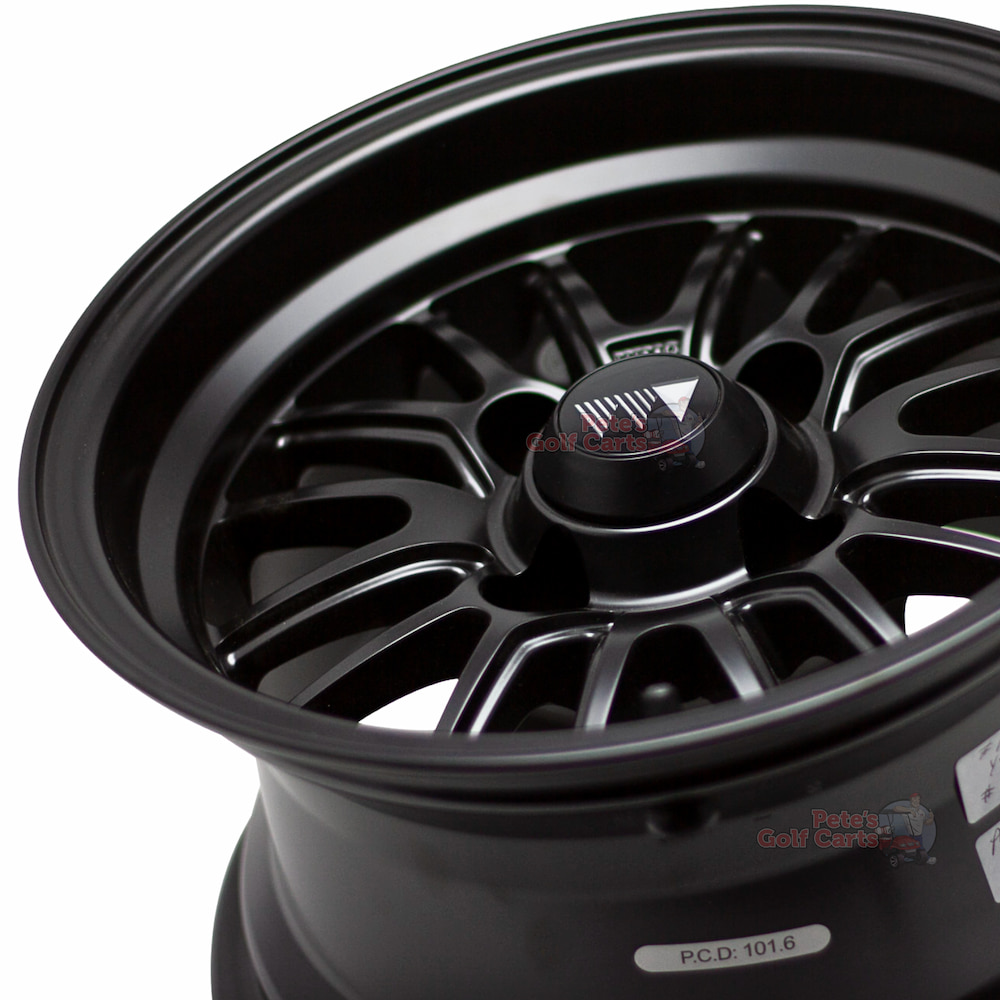 Experience the difference that a quality set of new golf cart wheels make on your cart. These beautiful 12″ TYPE V matte black golf cart wheels are a 12×7 wheel with an offset of -5mm.