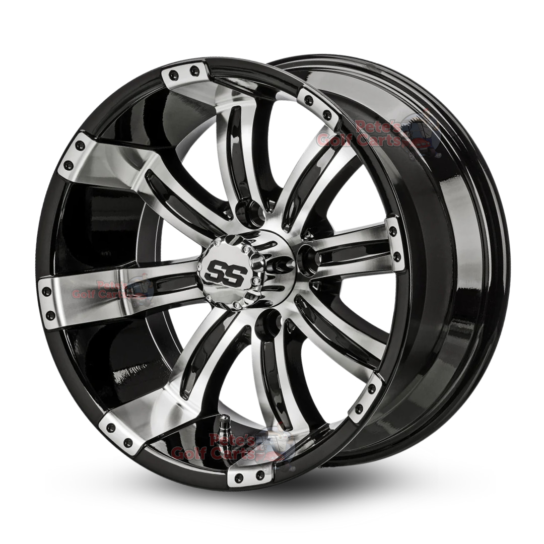 - Qty 4: 12″x7″ Tempest Black/Machined Golf Cart Wheels with ET-25 Offset