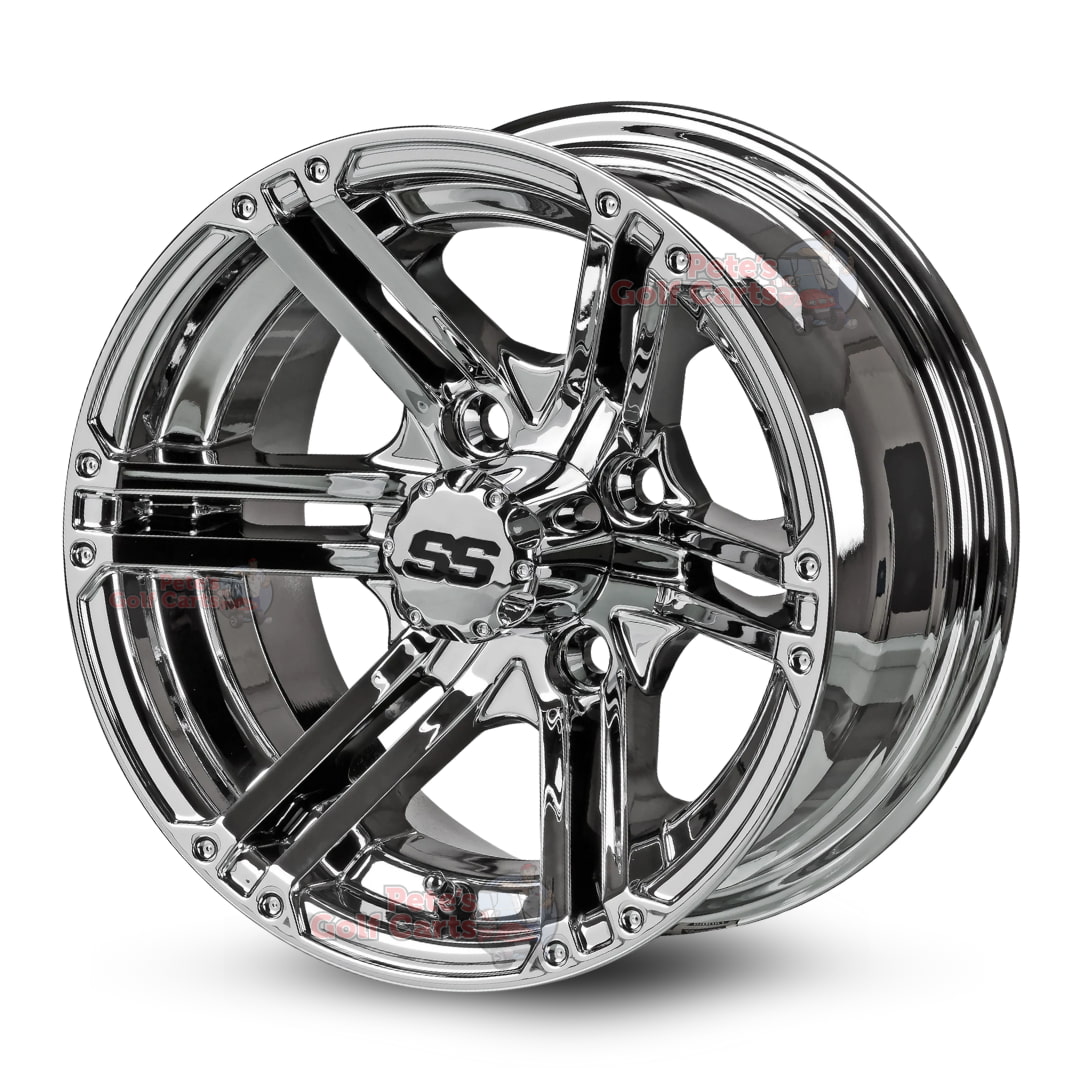 - Qty 4: 12″x7″ Terminator Chrome Golf Cart Wheels with centered Offset