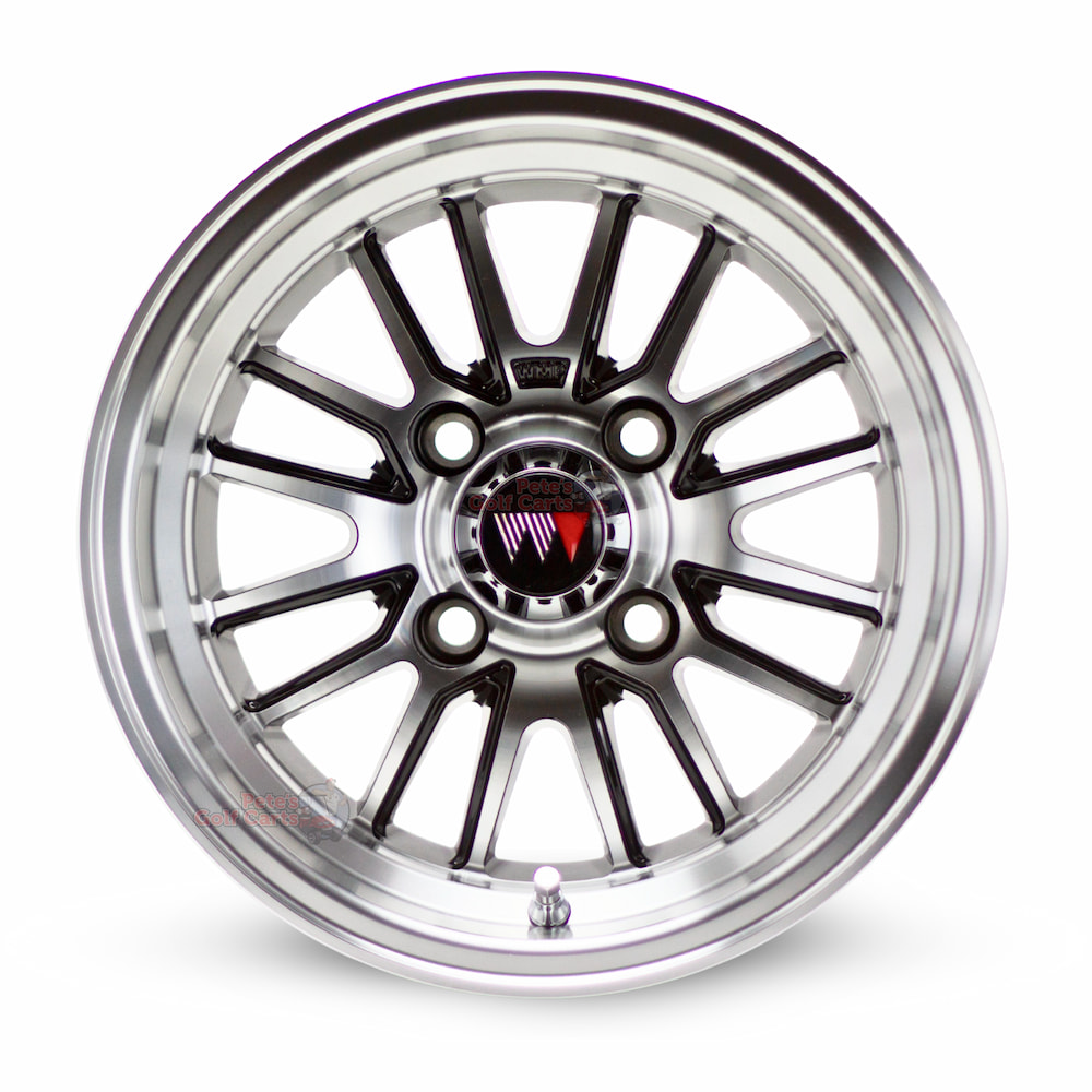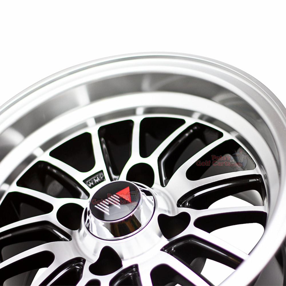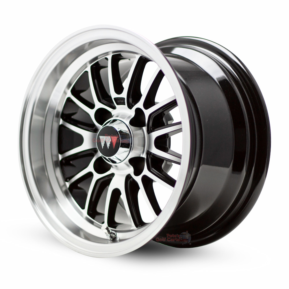 - 4 x 12″ Type V Machined Black Wheel Mate Aluminum Golf Cart Wheels (ET-5mm offset)