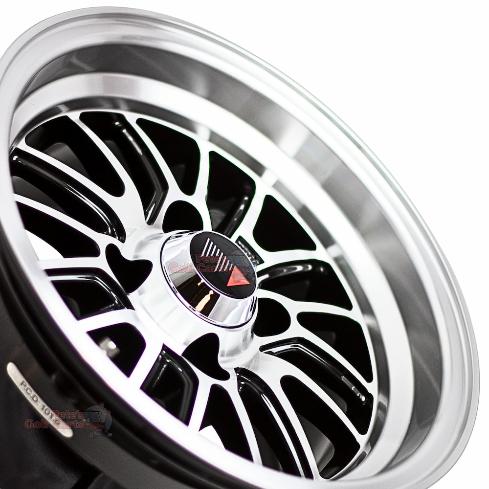 Experience the difference that a quality set of new golf cart wheels make on your cart. These beautiful 12″ TYPE V machined black golf cart wheels are a 12×7 wheel with an offset of -5mm.
