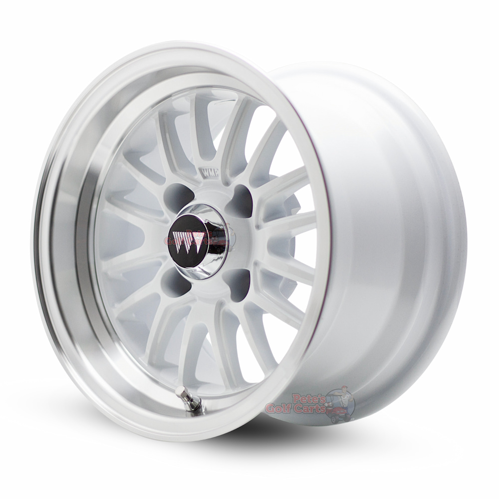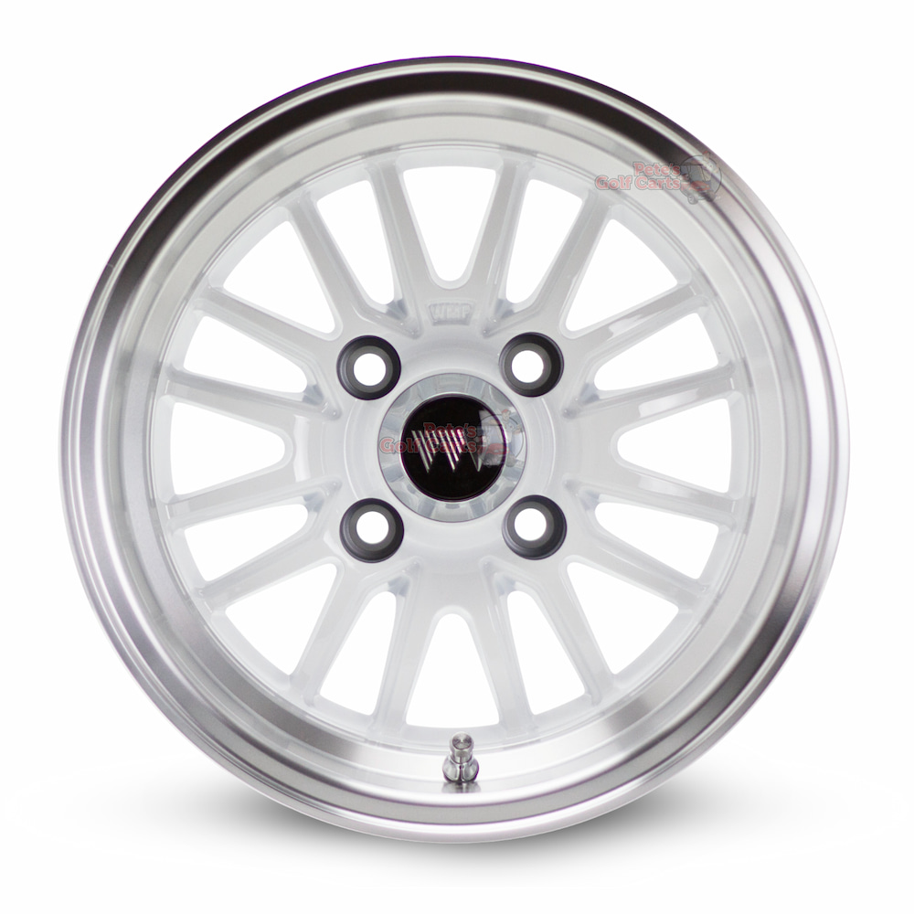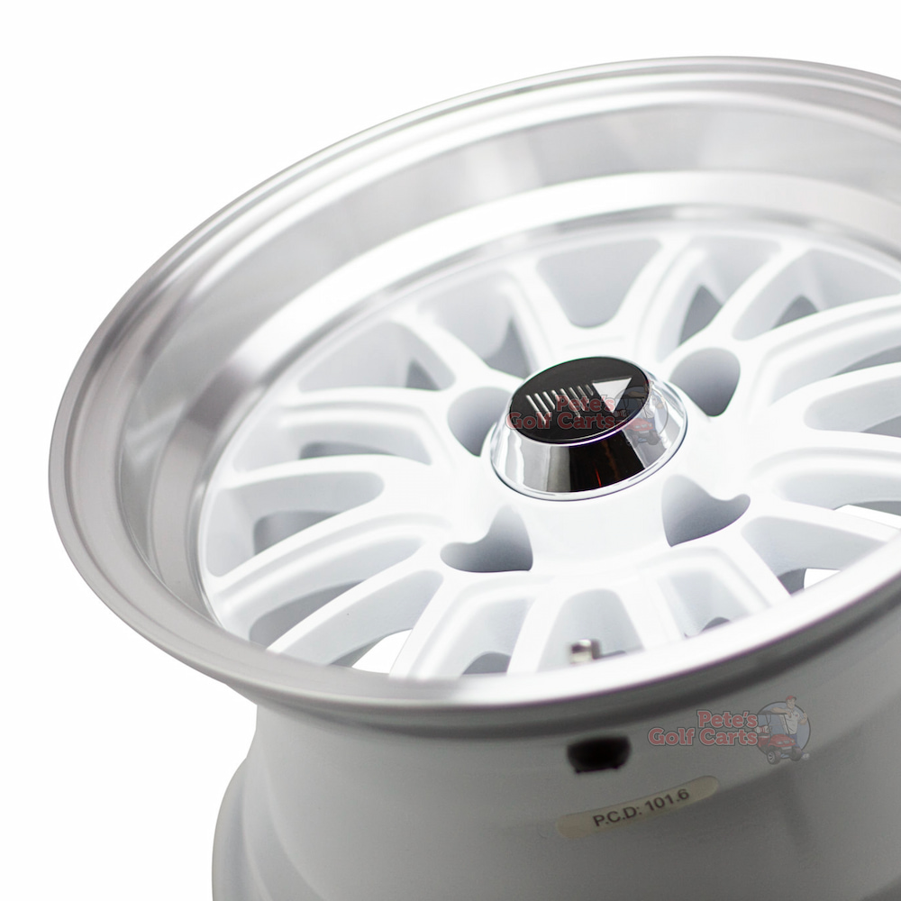 Experience the difference that a quality set of new golf cart wheels make on your cart. These beautiful 12″ TYPE V white finish with a machined lip golf cart wheels are a 12×7 wheel with an offset of -5mm.