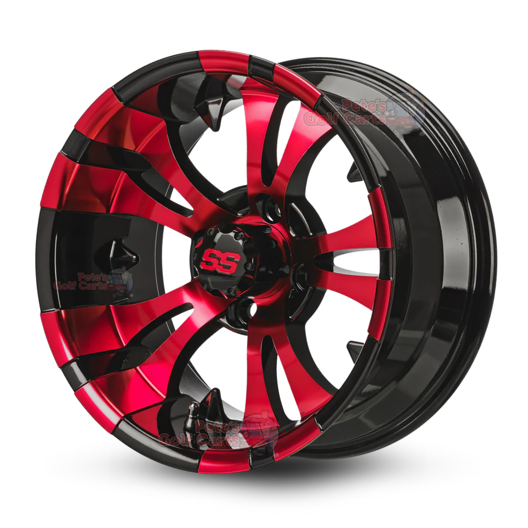 - Qty 4: 12″x7″ Vampireย Red/Black Golf Cart Wheels with ET-25 Offset