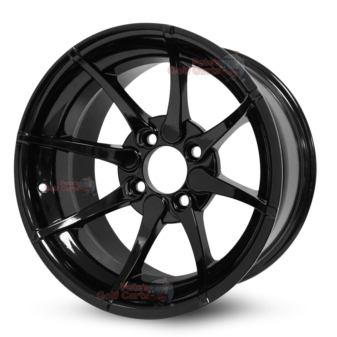 The 14″ Hydra Gloss Black golf cart wheels come as a set of 4 or a single replacement golf cart wheel. The Hydra wheel is one of the most popular and longest standing golf cart wheel designs and features 14″x7″ sizing, -12mm backspacing, and 4×101.6mm (commonly referred to as 4×4) lug pattern that will fit all common golf cart models.