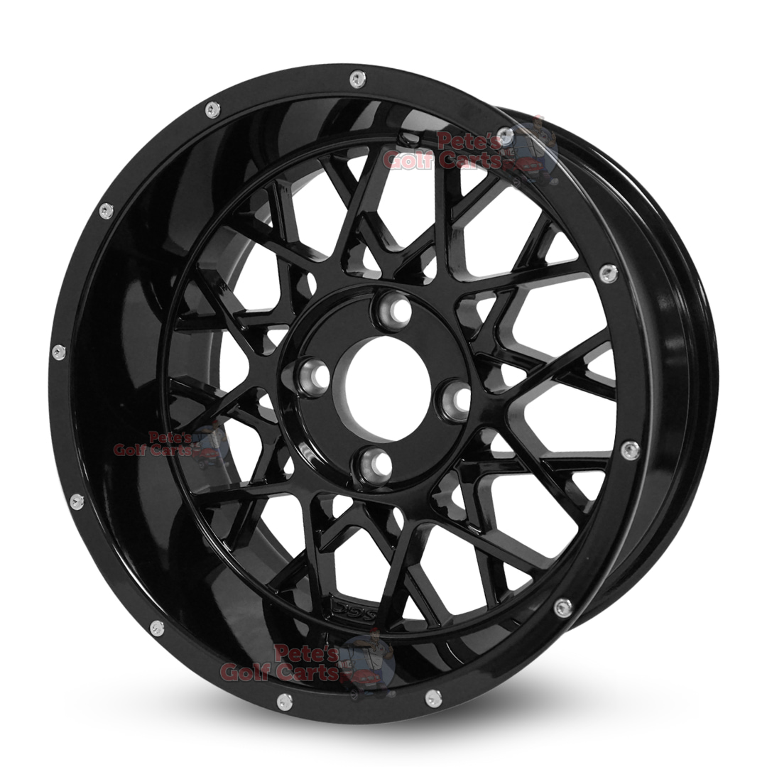 The 14″ Matrix Gloss Black golf cart wheels are sharp and head-turning. We offer these alloys as a full set of 4 or as a single replacement golf cart wheel. The detailed Matrix wheel design look amazing in the gloss black finish and enhance the appearance of your golf cart ride instantly! Featuring 14″x7″ sizing, -15mm backspacing, and 4×101.6mm (commonly referred to as 4×4) lug pattern, this golf cart wheel will fit all common golf cart models.