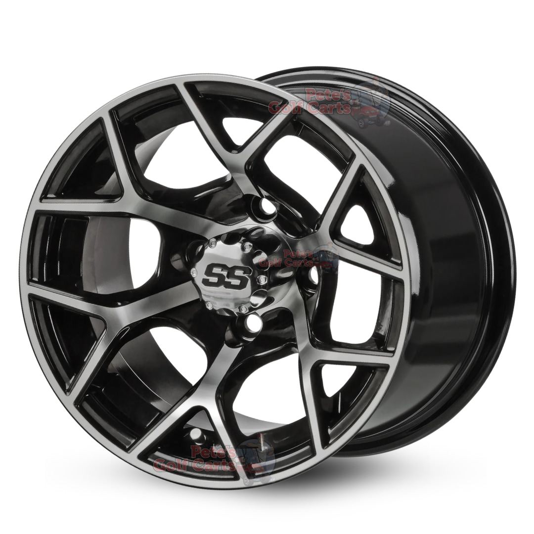 The 14″ Rally Black/Machined golf cart wheels come as a complete set of 4 or as a single golf cart wheel replacement. When it comes to 14″ golf cart wheels – you have come to the right place! These specific golf cart wheels are one of the most popular and longest standing golf cart wheel designs in the industry. They feature 14″x7″ sizing, -15mm backspacing, and 4×101.6mm (commonly referred to as 4×4) lug pattern, and will fit all common golf cart models.