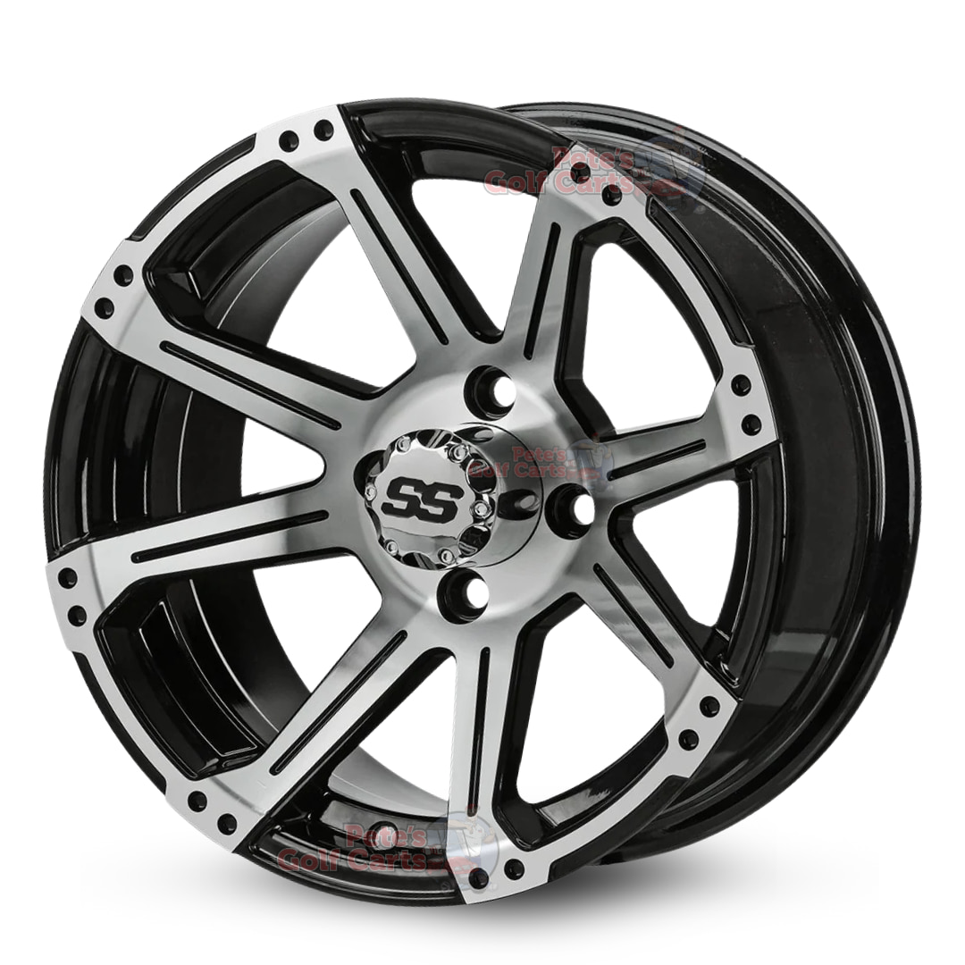 The 14″ Rampage Black/Machined golf cart wheels come as a complete set of 4 or as a single golf cart wheel replacement. When it comes to 14″ golf cart wheels – you have come to the right place! These specific golf cart wheels are one of the most popular and longest standing golf cart wheel designs in the industry. They feature 14″x7″ sizing, -15mm backspacing, and 4×101.6mm (commonly referred to as 4×4) lug pattern, and will fit all common golf cart models.