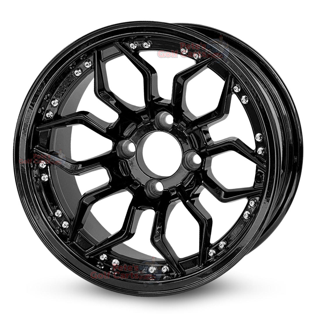 If you are looking for a quality set of new 14″ Scorpion Gloss Black golf cart wheels or just an individual replacement assembly you have come to the right place. The Scorpion is one of the most strikingly unique golf cart wheel designs on the market. Featuring 14″x7″ sizing, -20mm backspacing, and 4×101.6mm (commonly referred to as 4×4) lug pattern, this will fit all common golf cart models.