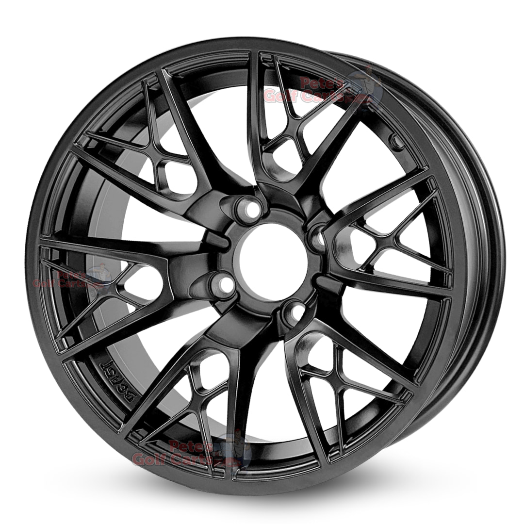 If you are looking for a quality set of new 14″ Saber Tooth Matte Black golf cart wheels or just an individual replacement assembly you have come to the right place. The Saber Tooth design is one of the most unique and eye-catching golf cart wheel designs on the market today. Featuring 14″x7″ sizing, -20mm backspacing, and 4×101.6mm (commonly referred to as 4×4) lug pattern, this will fit all common golf cart models.