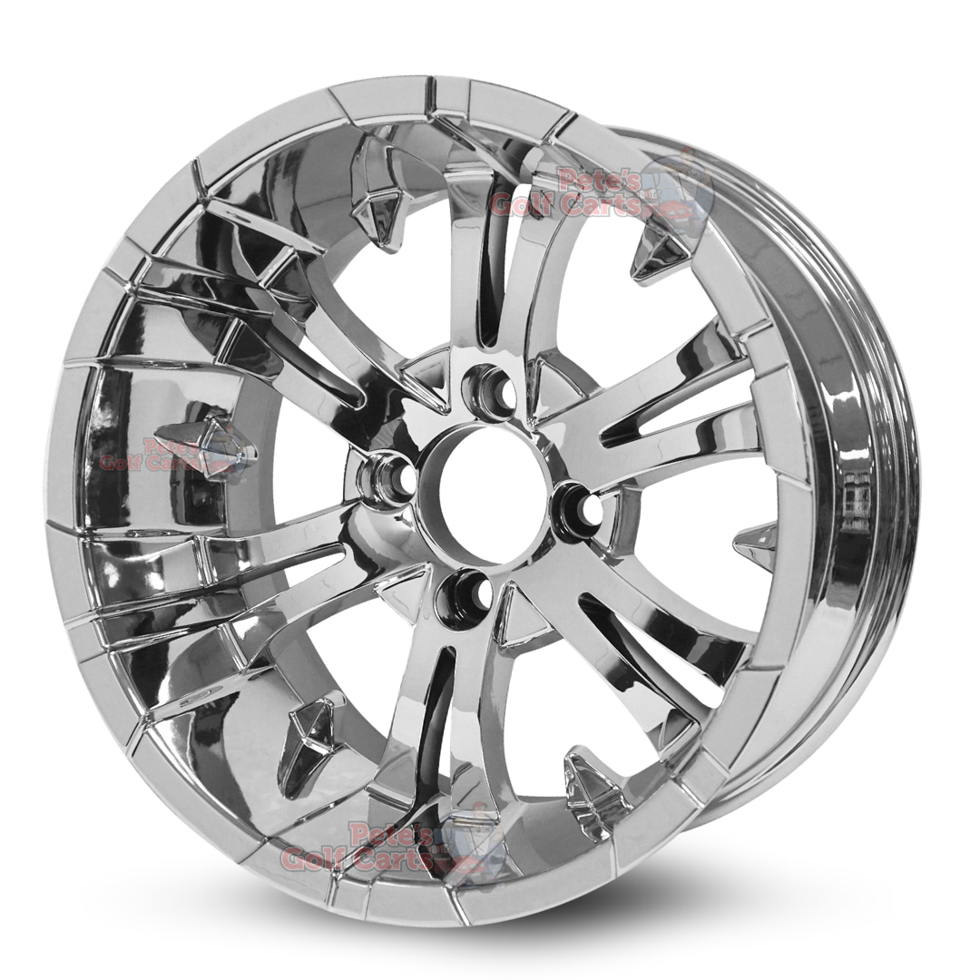 If you are looking for a quality set of new 14″ Vampire Chrome golf cart wheels or just an individual replacement assembly you have come to the right place. The Vampire design is one of the most popular and longest standing golf cart wheel designs. Featuring 14″x7″ sizing, -20mm backspacing, and 4×101.6mm (commonly referred to as 4×4) lug pattern, this will fit all common golf cart models.