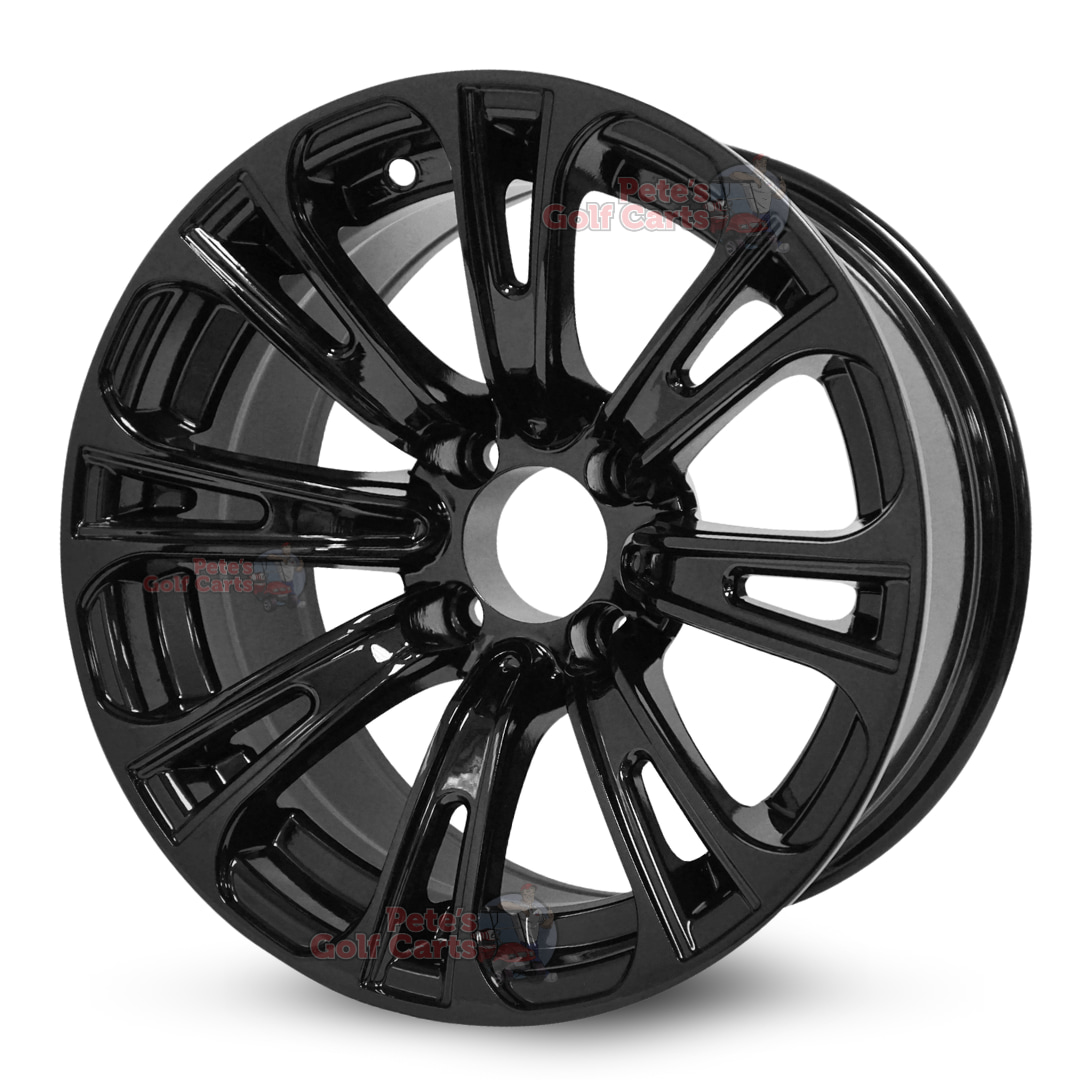 Our 14″ Voodoo Gloss Black golf cart wheels are super popular and transform your cart into a sporty machine. Purchase yours today as a complete set of 4 and save! The Voodoo is a multi-spoke wheel design that has been popular for years. Featuring 14″x7″ sizing, -20mm backspacing, and 4×101.6mm (commonly referred to as 4×4) lug pattern, this will fit all common golf cart models.