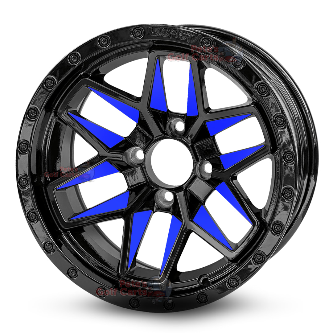 If you are looking for a quality set of new 14″ Widow Blue/Black golf cart wheels or just an individual replacement assembly you have come to the right place. The Widow design is one of the most popular and longest standing golf cart wheel designs. Featuring 14″x7″ sizing, -20mm backspacing, and 4×101.6mm (commonly referred to as 4×4) lug pattern, this will fit all common golf cart models.