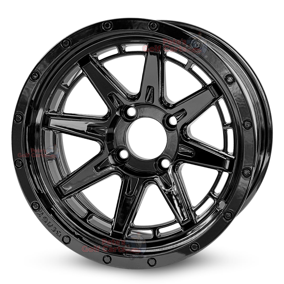 Cool new designs and great quality meet great value with every golf cart wheel Pete offers. Pete says all orders over $99 ship free freight in the US. Order your set today and save big! This specific golf cart wheel includes the center cap. (Universal fitment on and golf cart, this wheel will fit your Club Car, Columbia, EZ-GO, Gem Car, Tomberlin, Star Car and Yamaha golf cart.) Lug nuts sold separately.