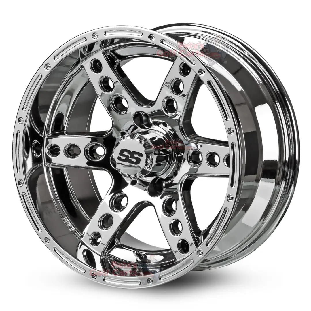 The 14″ Dominator Matte Black golf cart wheels come as a complete set of 4 or as a single golf cart wheel replacement. When it comes to 14″ golf cart wheels – you have come to the right place! These specific Tempest golf cart wheels are one of the most popular and longest standing golf cart wheel designs in the industry. They feature 14″x7″ sizing, -15mm backspacing, and 4×101.6mm (commonly referred to as 4×4) lug pattern, and will fit all common golf cart models.