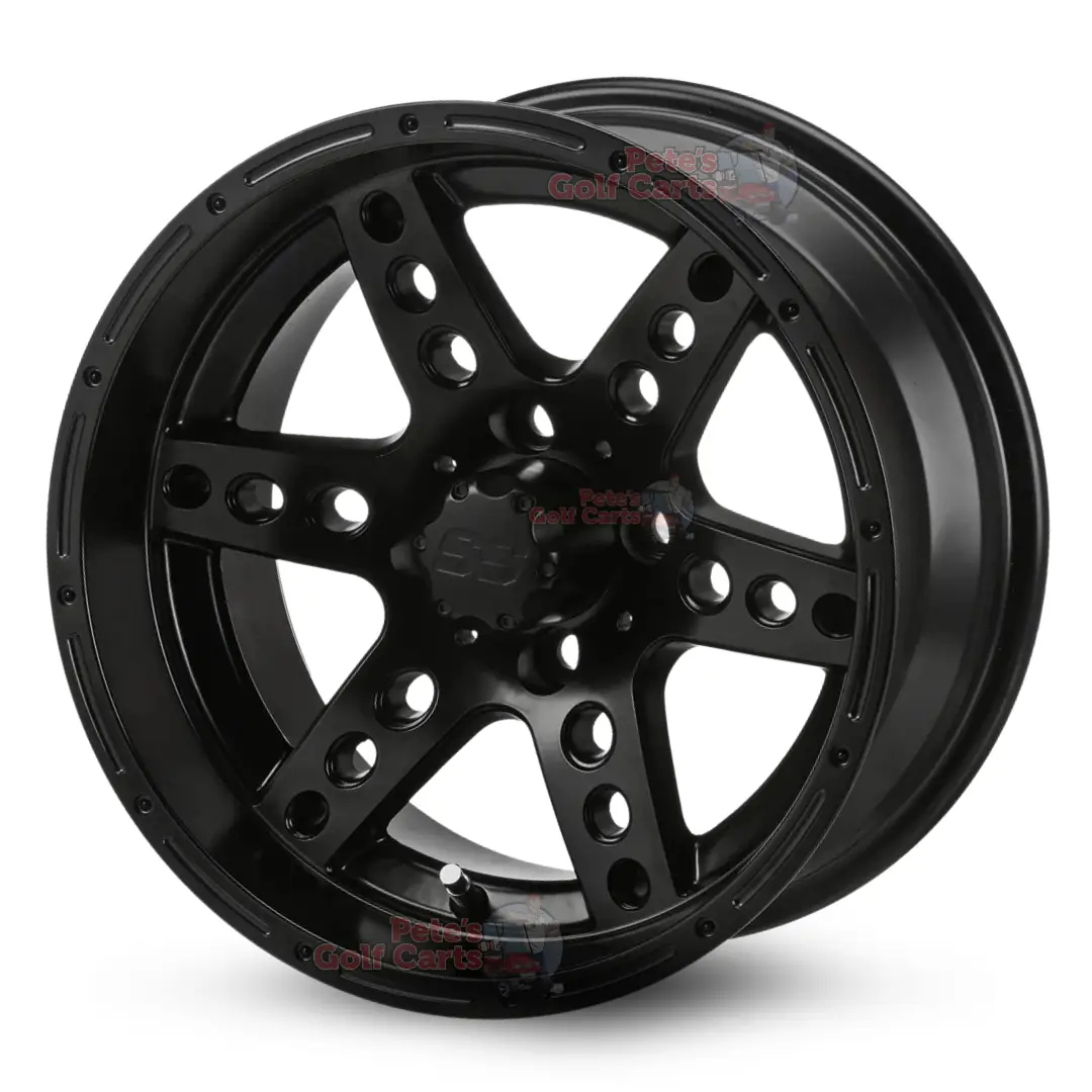 The 14″ Dominator Matte Black golf cart wheels come as a complete set of 4 or as a single golf cart wheel replacement. When it comes to 14″ golf cart wheels – you have come to the right place! These specific Tempest golf cart wheels are one of the most popular and longest standing golf cart wheel designs in the industry. They feature 14″x7″ sizing, -15mm backspacing, and 4×101.6mm (commonly referred to as 4×4) lug pattern, and will fit all common golf cart models.