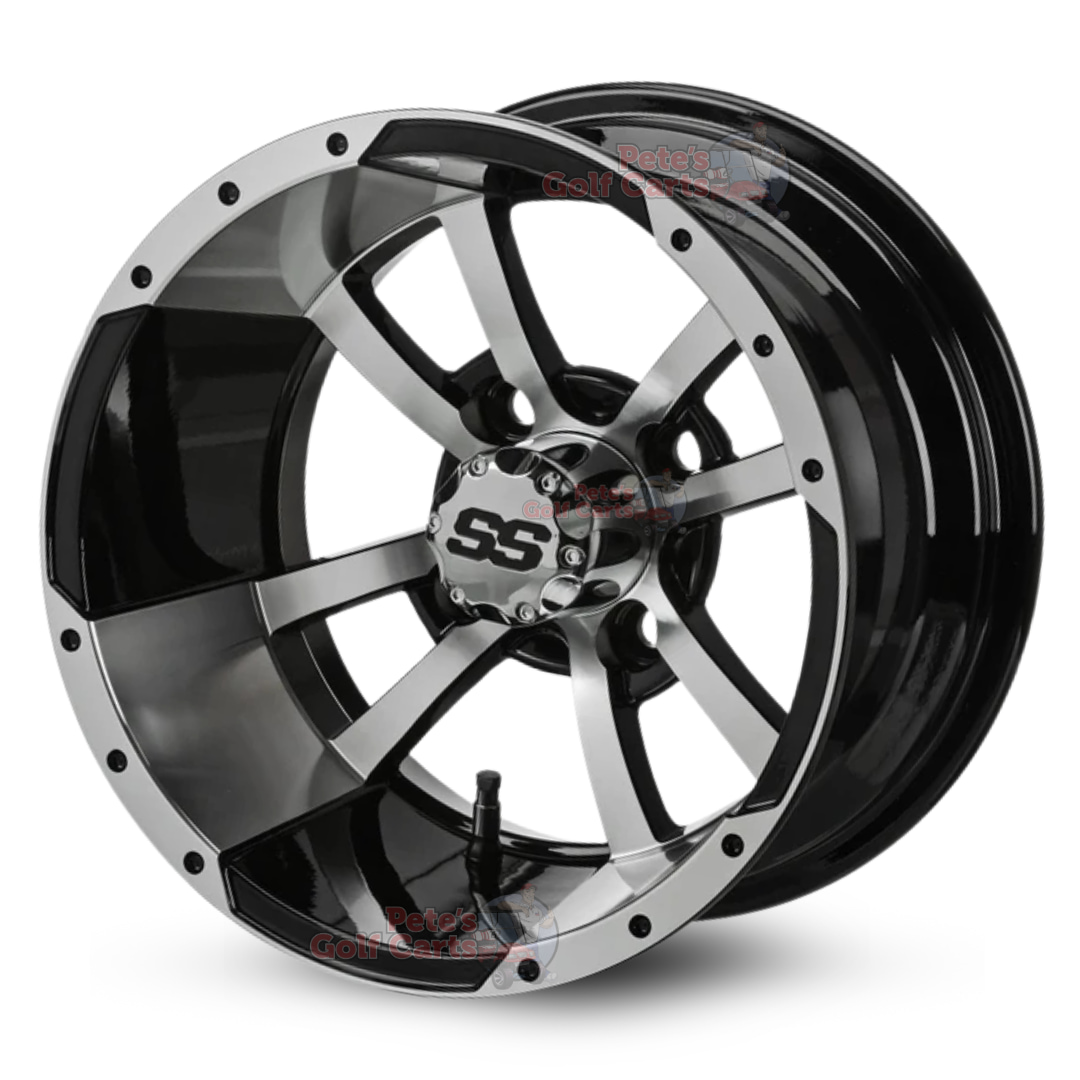 The 14″ Storm Trooper Black/Machined golf cart wheels come as a complete set of 4 or as a single golf cart wheel replacement. When it comes to 14″ golf cart wheels – you have come to the right place! These specific golf cart wheels are one of the most popular and longest standing golf cart wheel designs in the industry. They feature 14″x7″ sizing, -15mm backspacing, and 4×101.6mm (commonly referred to as 4×4) lug pattern, and will fit all common golf cart models.